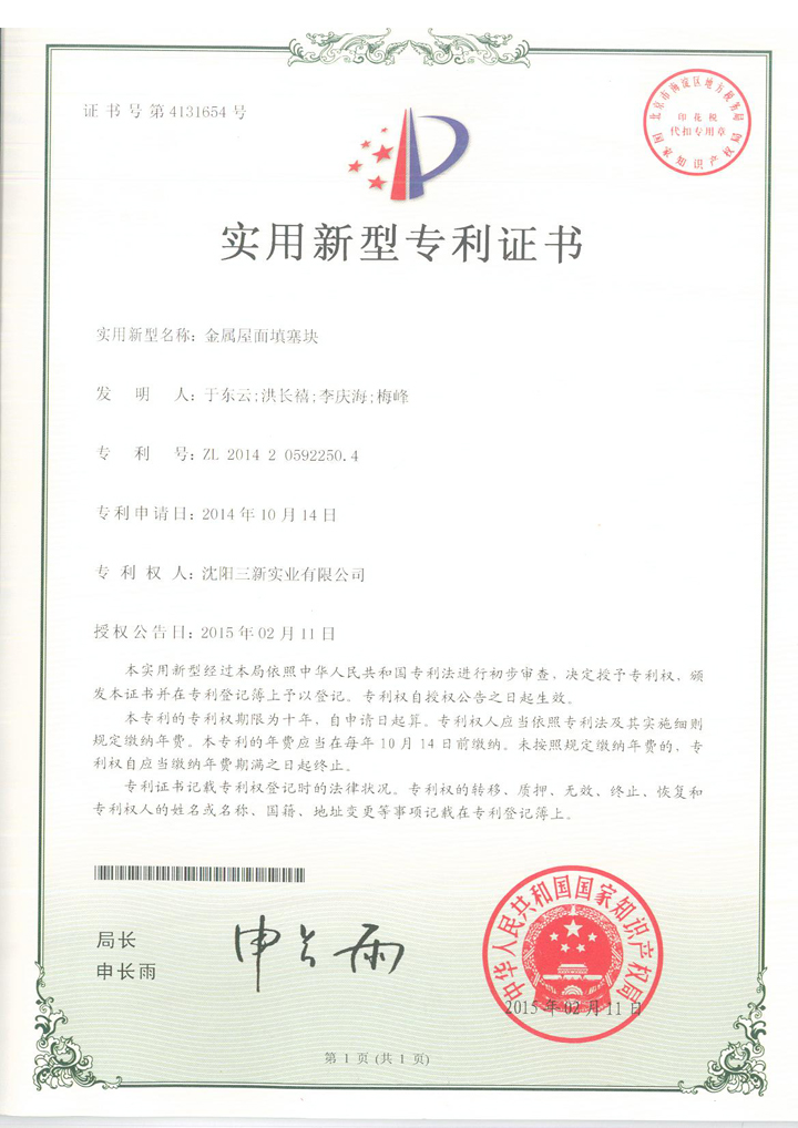 金屬屋面填塞塊專利