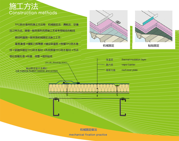 為確保卷材防水層在屋面的整體性,關(guān)鍵之一是搭接處理,通過(guò)熱焊接使相鄰卷材搭接形成高于卷材強(qiáng)度的粘結(jié)層,形成卷材整體的連續(xù)密封防水層。 TPO卷材與屋面的固定方式: